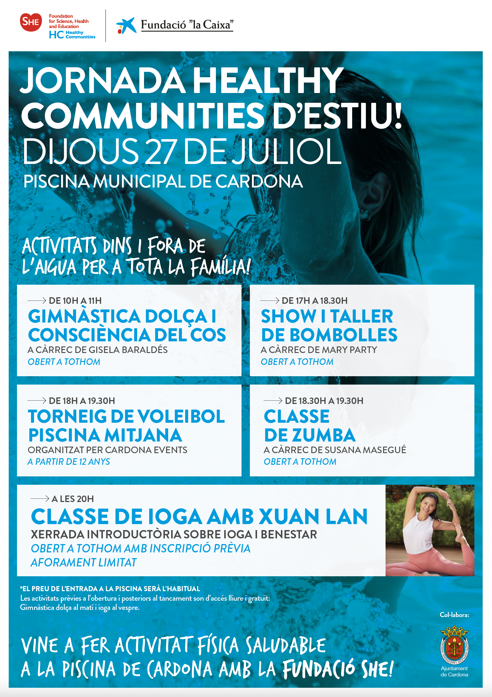 Des de la Fundació SHE, amb el suport de la Fundació “la Caixa” organitzem una jornada gratuïta el 27 de juliol a la Piscina Municipal de Cardona per promoure la vida…